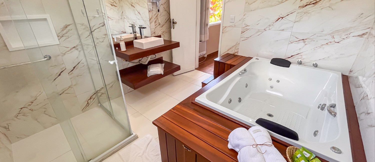 A SUĂTE DO MARQUĂS Ă EQUIPADA COM: CAMA BOX, TV LCD 50â, FRIGOBAR, AR CONDICIONADO, VENTILADOR DE TETO, TELEFONE, Wi-Fi (INTERNET), TV A CABO, HIDROMASSAGEM