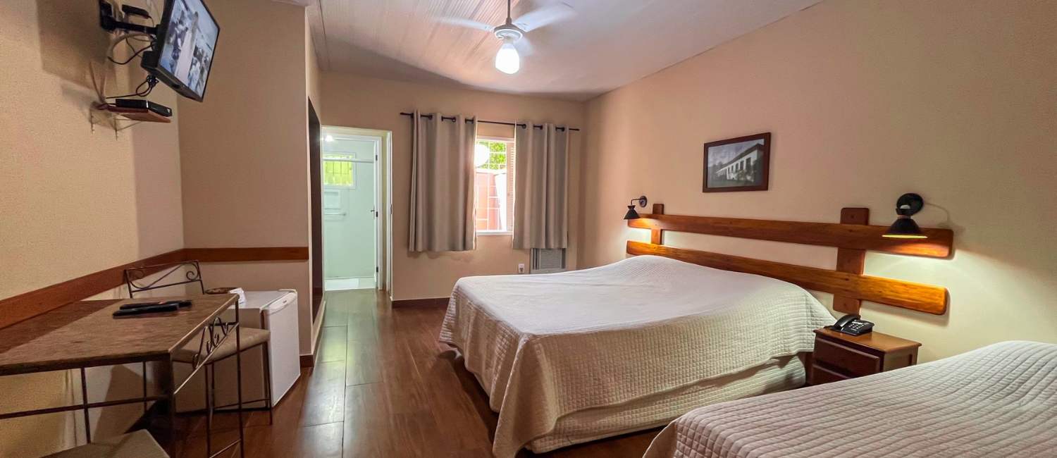 A SUĂTE DO DUQUE Ă EQUIPADA COM: TV LCD 32â, FRIGOBAR, AR CONDICIONADO, VENTILADOR DE TETO, TELEFONE, Wi-Fi (INTERNET), TV A CABO. IDEAL PARA FAMĂLIA!