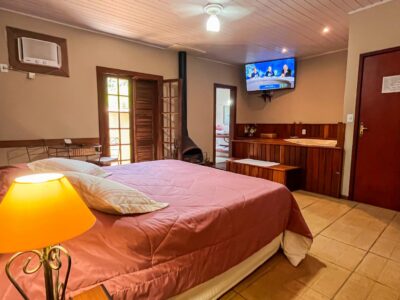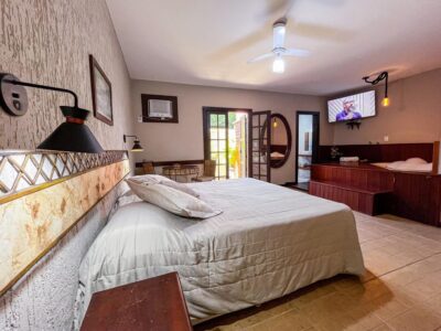 A SUÍTE DO IMPERADOR É EQUIPADA COM: CAMA BOX, TV 55”, FRIGOBAR, AR CONDICIONADO, VENTILADOR DE TETO, TELEFONE, INTERNET, TV A CABO, HIDROMASSAGEM, LAREIRA